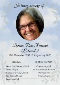 A requiem mass to celebrate Dulcie’s life will be held on Tuesday 13th January at St Josephs Catholic Church Warrnambool - followed by burial at Warrnambool Cemetery.